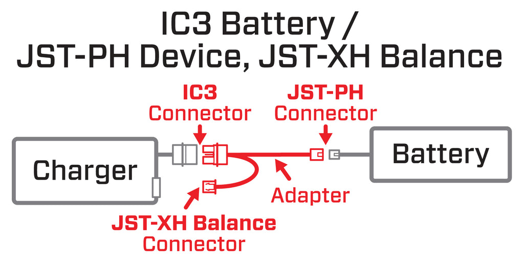 Spektrum RC Charge Lead Adapter. This adapter is a great option to allow you to charge a battery with a JST-PH connector with a Spektrum RC Smart Charger. The adapter features a female IC3 connector to a male JST-PH connector and uses a standard JST-XH connector for balancing. Package includes one charge lead adapter.