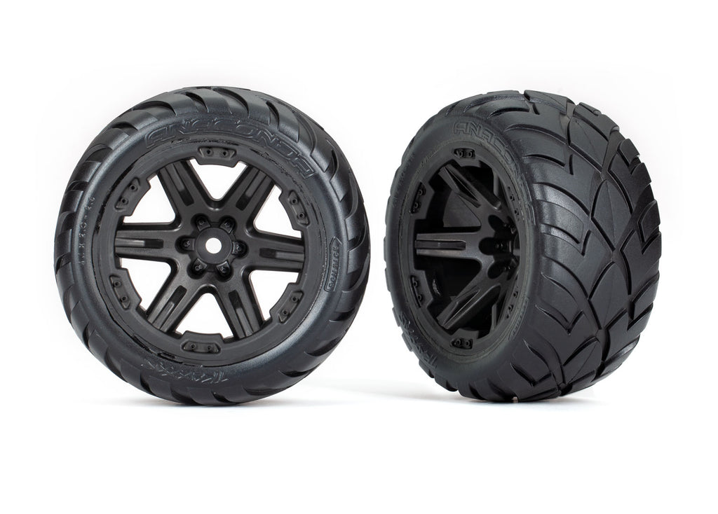 Traxxas Anaconda 2.8" Pre-Mounted Tires with RXT Wheels. Anaconda performance street tires feature a specially formulated tire compound providing a long lasting traction. These tires are mounted and pre-glued on tough RXT black wheels. Molded-foam inserts coupled with the directional tread design provide a balanced feel for the ultimate high-speed on-road experience. These optional pre-mounts may be used on the front of the Traxxas Rustler 2WD and the front or rear of the Traxxas Rustler 4x4. Package includes two pre-mounted tires.