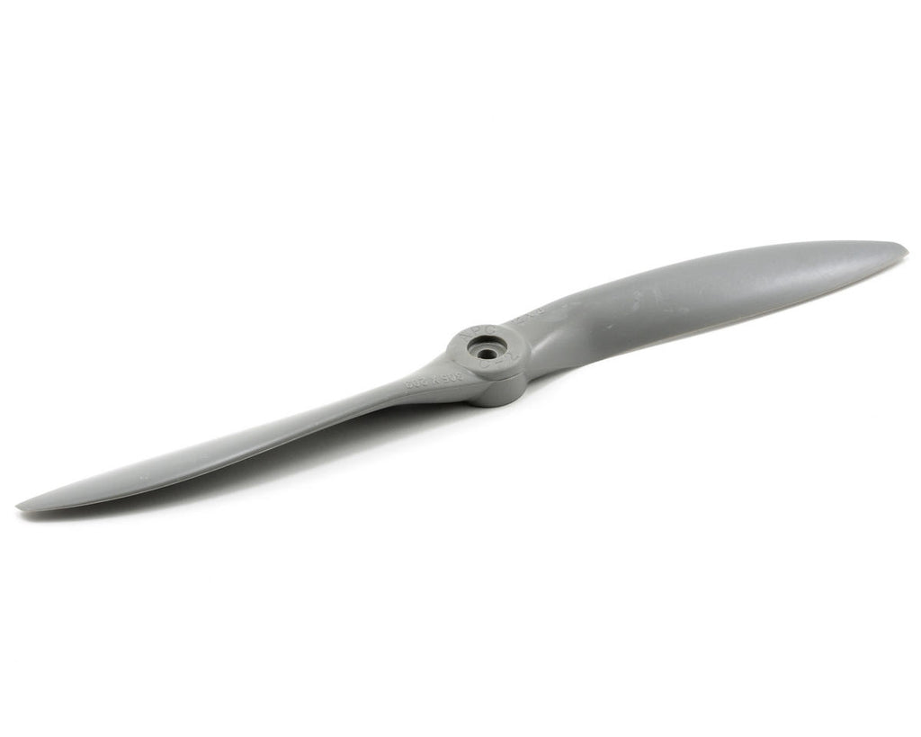 Esta es la hélice deportiva APC 12x8. Las hélices APC se fabrican mediante un proceso de pultrusión que permite una mayor densidad de fibra (60 %) que de resina (aglomerante de nailon). Esto proporciona una resistencia y rigidez sustancialmente mayores que el nailon reforzado con fibra de vidrio. La rigidez adicional es beneficiosa para controlar la respuesta de resonancia de vibraciones. La mayor resistencia permite el uso de secciones transversales más delgadas, beneficiosas para el peso y la eficiencia aerodinámica.