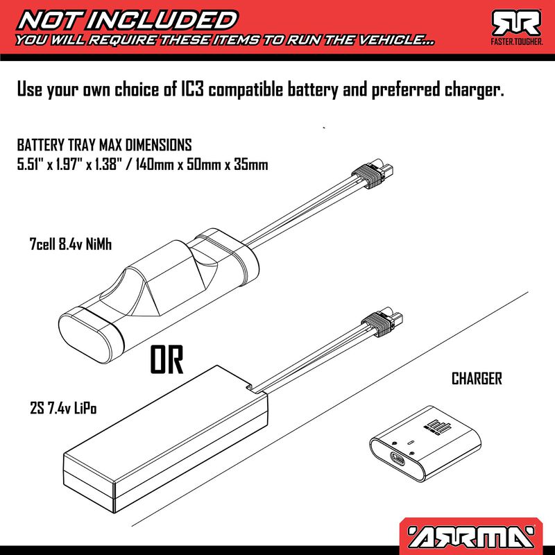 Proven ARRMA engineering gives the composite chassis the durability for bashing over punishing surfaces. The independent suspension, oil-filled shocks, and adjustable ride height combine to provide a smooth ride over uneven terrain. For unstoppable traction, the stadium truck's metal gear differential moves power from the installed MEGA 550 motor to the all-terrain rear tires.