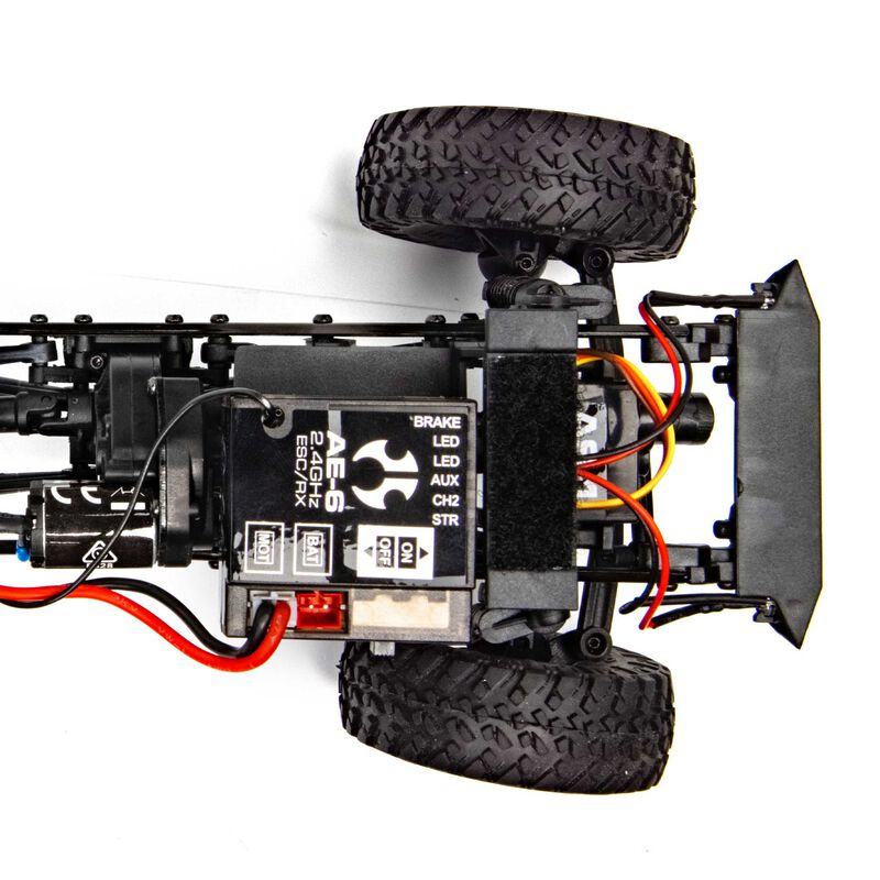 Sea cual sea el rumbo que sigas, el SCX24 ™ El chasis supera todos los desafíos con tracción permanente en las 4 ruedas, una suspensión delantera de 3 brazos/trasera de 4 brazos que domina los senderos y mucho más. Los rieles de marco de acero realistas resisten golpes duros. Los engranajes helicoidales en los ejes aumentan la distancia al suelo. La nueva distancia entre ejes 22 mm más larga aumenta la estabilidad, mientras que los ejes delantero y trasero de acero, las manguetas delanteras y los dogbones de acero te permiten gatear y escalar con confianza. La energía es suministrada por un Dynamite ® Motor 88T y batería LiPo 2S. Se incluye un sistema de radio de 2 canales para un control preciso y confiable.