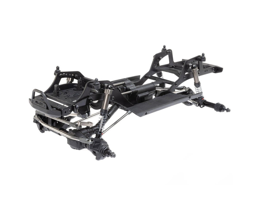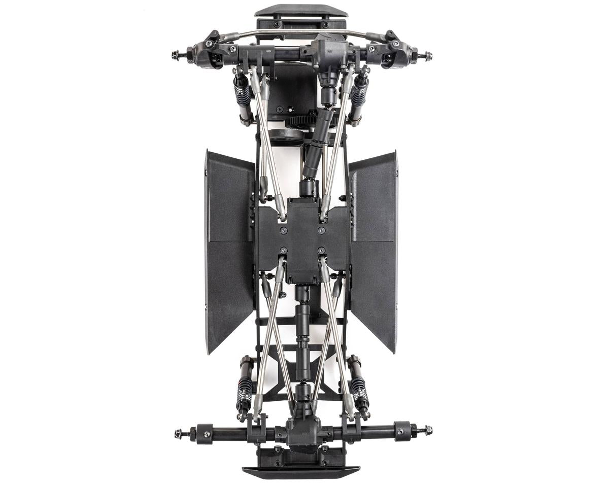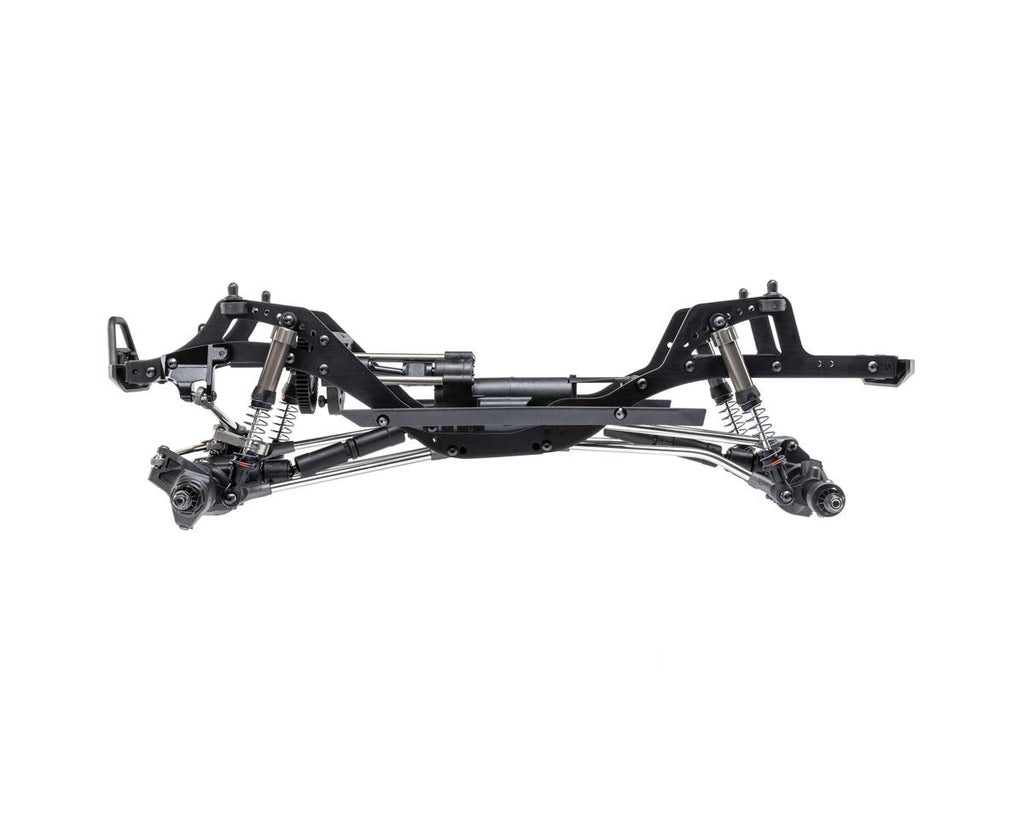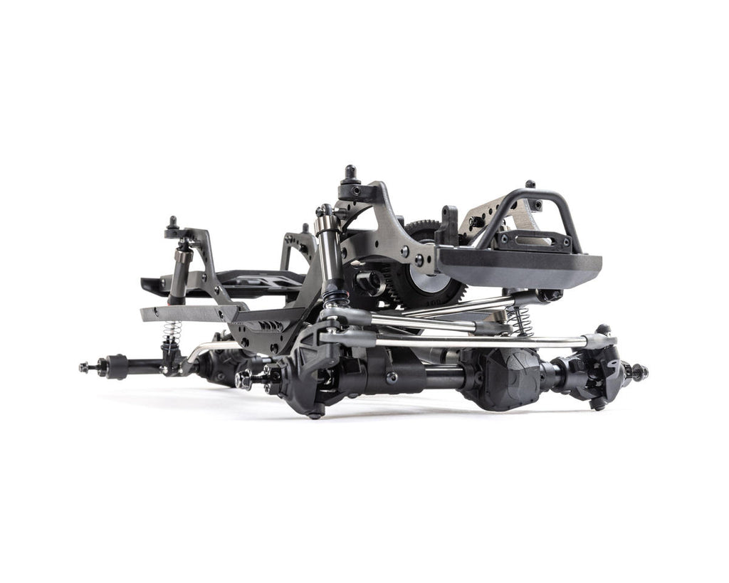 El chasis Pro ligero y altamente ajustable es un diseño específico de competición que está optimizado para escalar, subir pendientes laterales y romper. Los ejes de varias piezas están construidos con tubos de acero y pueden acomodar un servo montado en el chasis (CMS) o montado en el eje (AMS). El montaje del motor coloca el motor bajo y hacia adelante en el chasis para mejorar la distribución del peso. También le permite reducir la marcha del eje trasero a través de un servo o bloquear manualmente el eje trasero en 1: 1 o submarcha.
