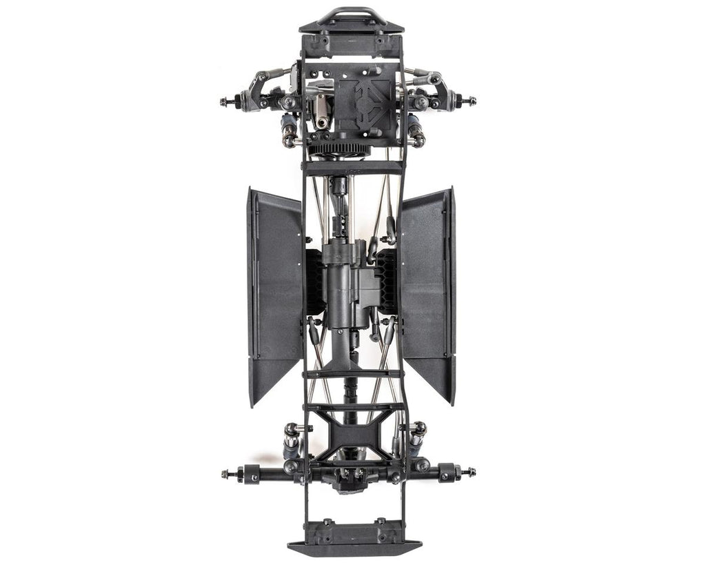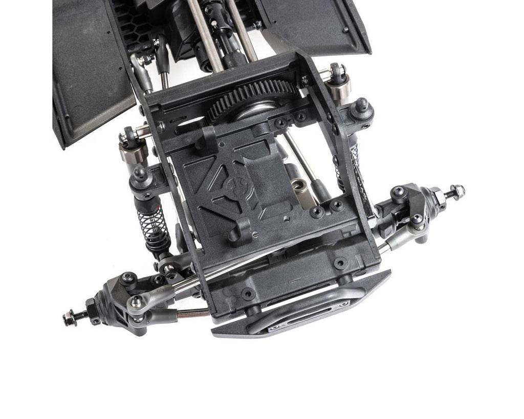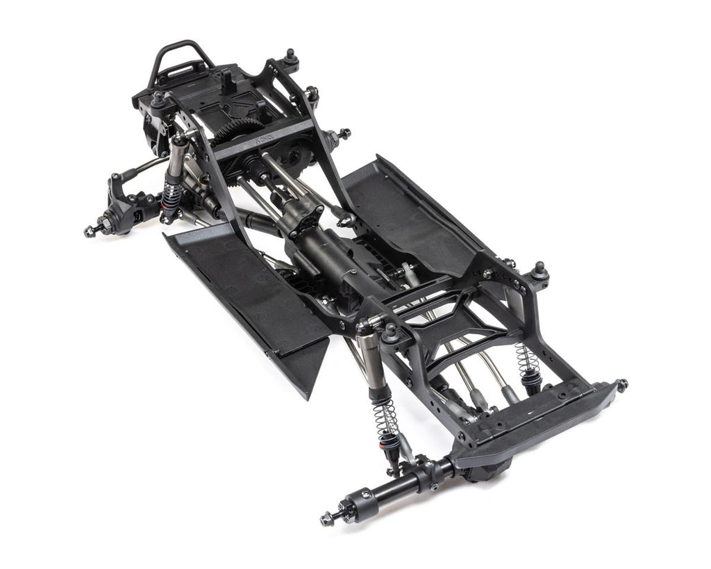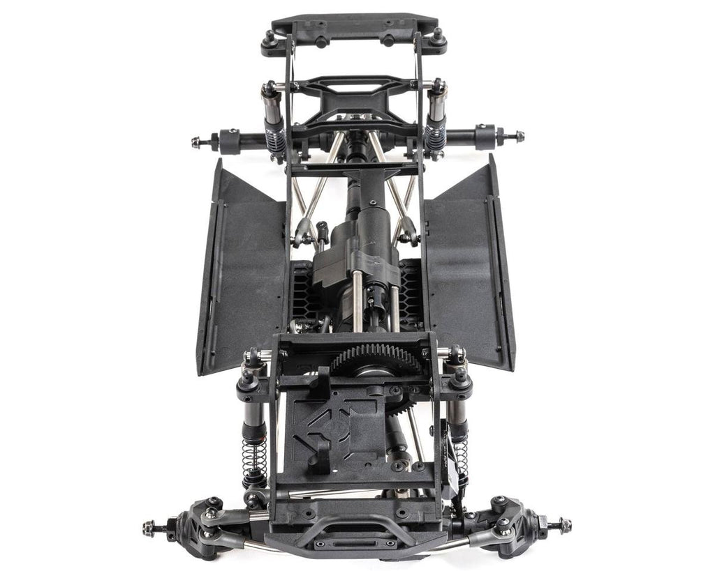El chasis Pro ligero y altamente ajustable es un diseño específico de competición que está optimizado para escalar, subir pendientes laterales y romper. Los ejes de varias piezas están construidos con tubos de acero y pueden acomodar un servo montado en el chasis (CMS) o montado en el eje (AMS). El montaje del motor coloca el motor bajo y hacia adelante en el chasis para mejorar la distribución del peso. También le permite reducir la marcha del eje trasero a través de un servo o bloquear manualmente el eje trasero en 1: 1 o submarcha.