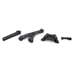 Este es un juego de refuerzo de chasis Losi de reemplazo y está diseñado para usarse con el camión Losi Ten-T. Estas piezas se unen a los conjuntos de suspensión delantera y trasera y se utilizan para endurecer el chasis y evitar la flexión. Este juego también incluye la placa superior delantera que asegura la cremallera de dirección y se fija al mamparo delantero.