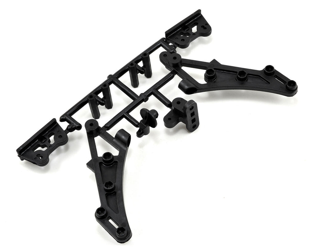 Este es un juego de soporte de ala Kyosho de repuesto. Estos son compatibles con la línea completa de buggies a escala 1/8 de Kyosho MP9. El paquete incluye soportes de alerón trasero izquierdo y derecho, placas de montaje de ala, un soporte de soporte de chasis trasero y un soporte de carrocería trasero.