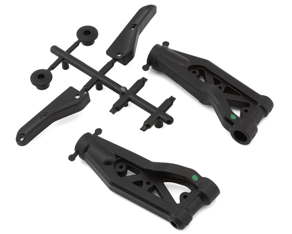 Team Associated RC8B4 Front Upper Suspension Arms. Molded from more flexible material to increase traction level, these replacement front upper suspension arms are intended for the Team Associated RC8B4 and RC8B4e 1/8 buggy platforms. Package includes two front upper suspension arms with two arm inserts.