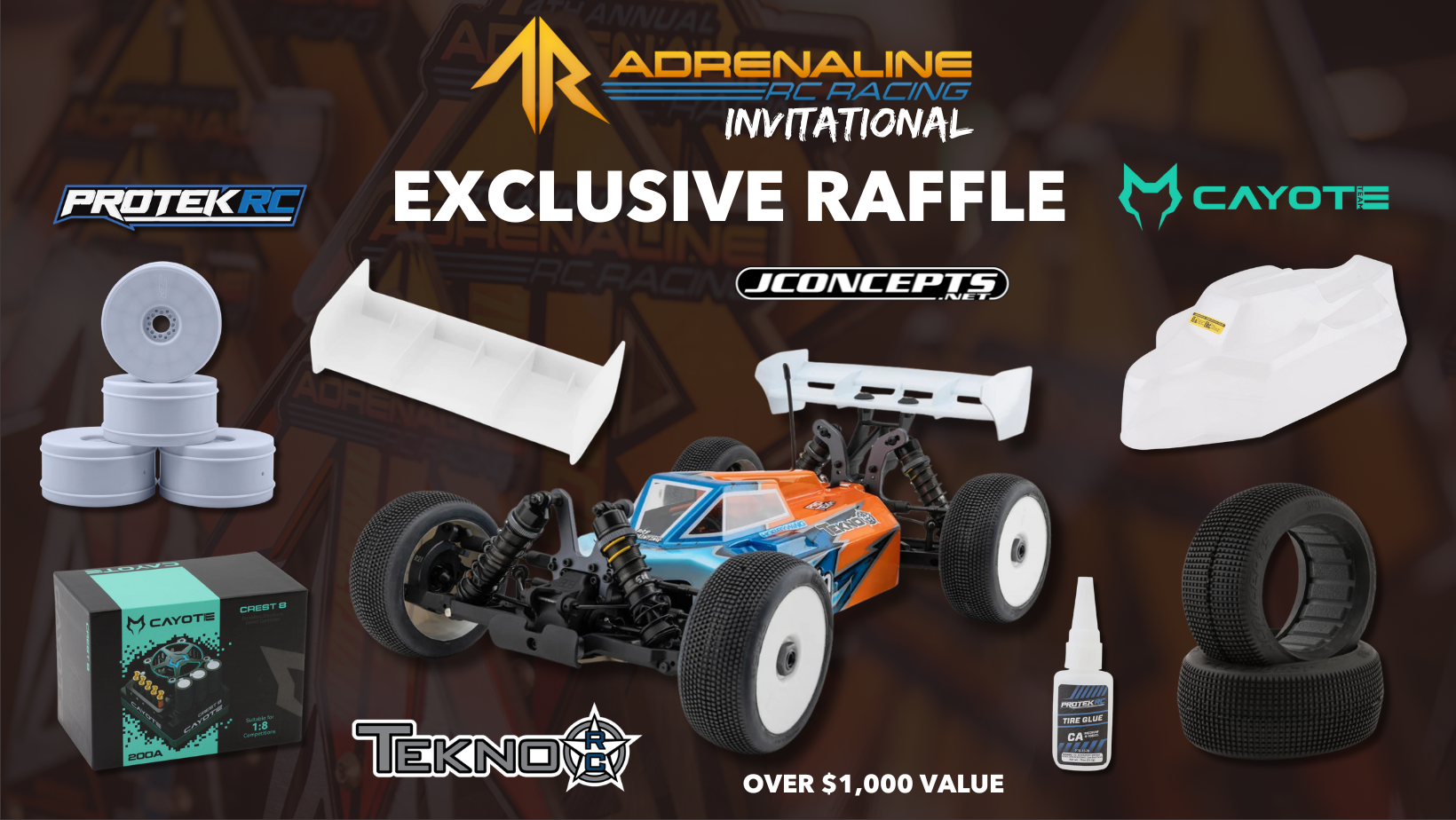 Drivers at the 2025 Adrenaline RC Invitational will have the chance to purchase raffle tickets for an incredible prize pack valued at over $1,000! The bundle includes a Tekno EB48 2.2 kit, Cayote Crest 8 ESC, and gear from JConcepts and ProTek RC.