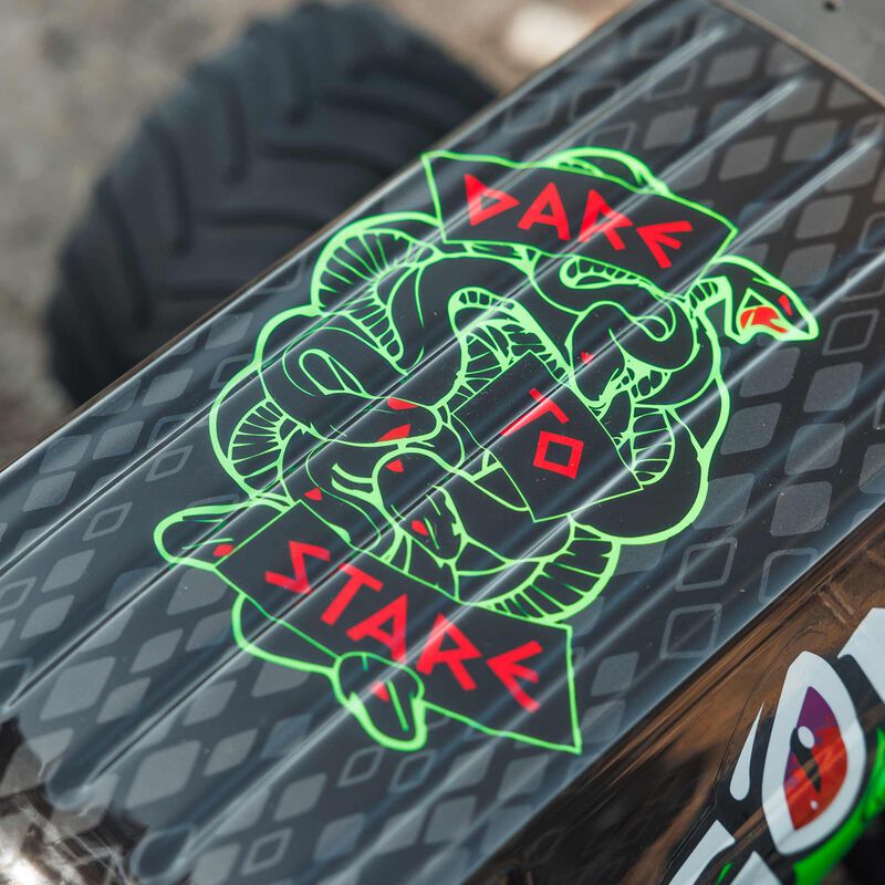 No options are needed for the GORGON MT to make you the center of attention from the start. Straight out of the box, its strikingly original looks draw a crowd. The body comes factory-finished in your choice of red or fluorescent yellow, with color-coordinated shock springs, battery tray, skid plates, and front and rear bumpers that resist impacts and help protect those "fang-tastic" graphics.