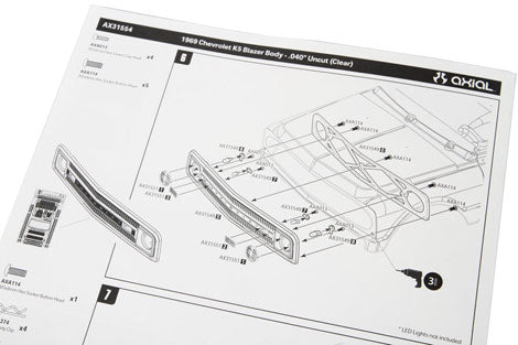 Axial 1969 Chevy K5 Blazer Body. Package includes clear body, roll cage and grille assemblies, hardware, body mounts, decals and window masks.