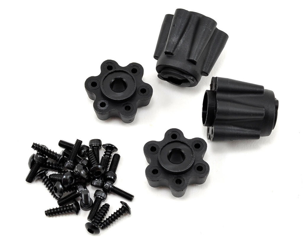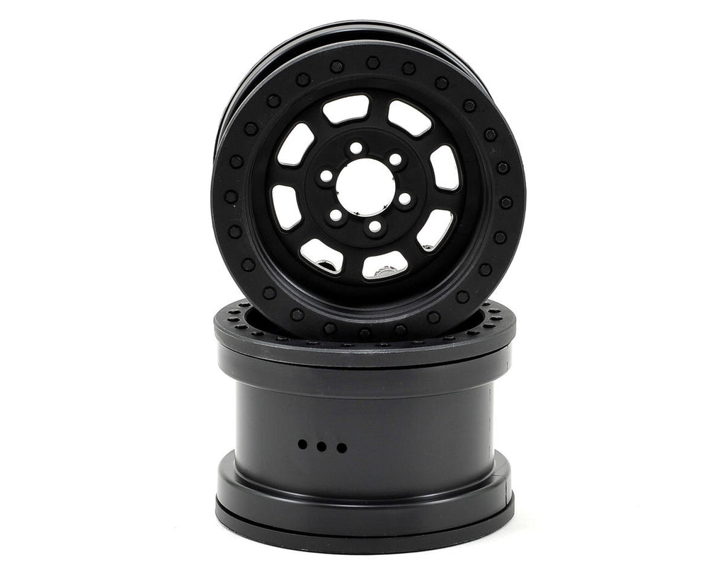 This is a pair of two Axial Black 2.2 Trail Ready HD Series Beadlock IFD Wheels, with Slim Rings. Officially licensed Trail Ready HD Series beadlock wheels dressed in an aggressive all black style are easy to assemble and they work with most 2.2 tires. The hub design allows this wheel to mount to any Wraith, AX10 Ridgecrest or SCX10. Our IFD™ (Interchangeable Face Design) wheel system makes it easy to dress it up with a new look.