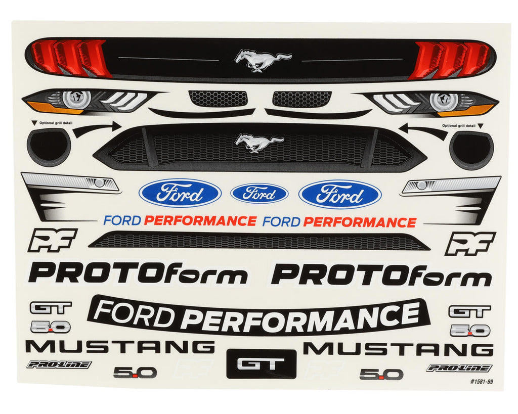 This Mustang is formed from durable 1.5mm thick high-quality polycarbonate with paint-then-peel overspray film, and it also includes a detailed decal sheet and wing mounting hardware. This body was designed with wider rear fenders as a direct fit for the Felony™ to clear the 53/107 tires. It will work with Infraction™ rear tires, but to get the optimal look and fit, you can optionally choose to either widen the rear of your Infraction™ chassis with stock rear tires or use Felony™ rear tires with modifications to the rear gear ratio. See the fits tab for the list of parts needed for these modifications.