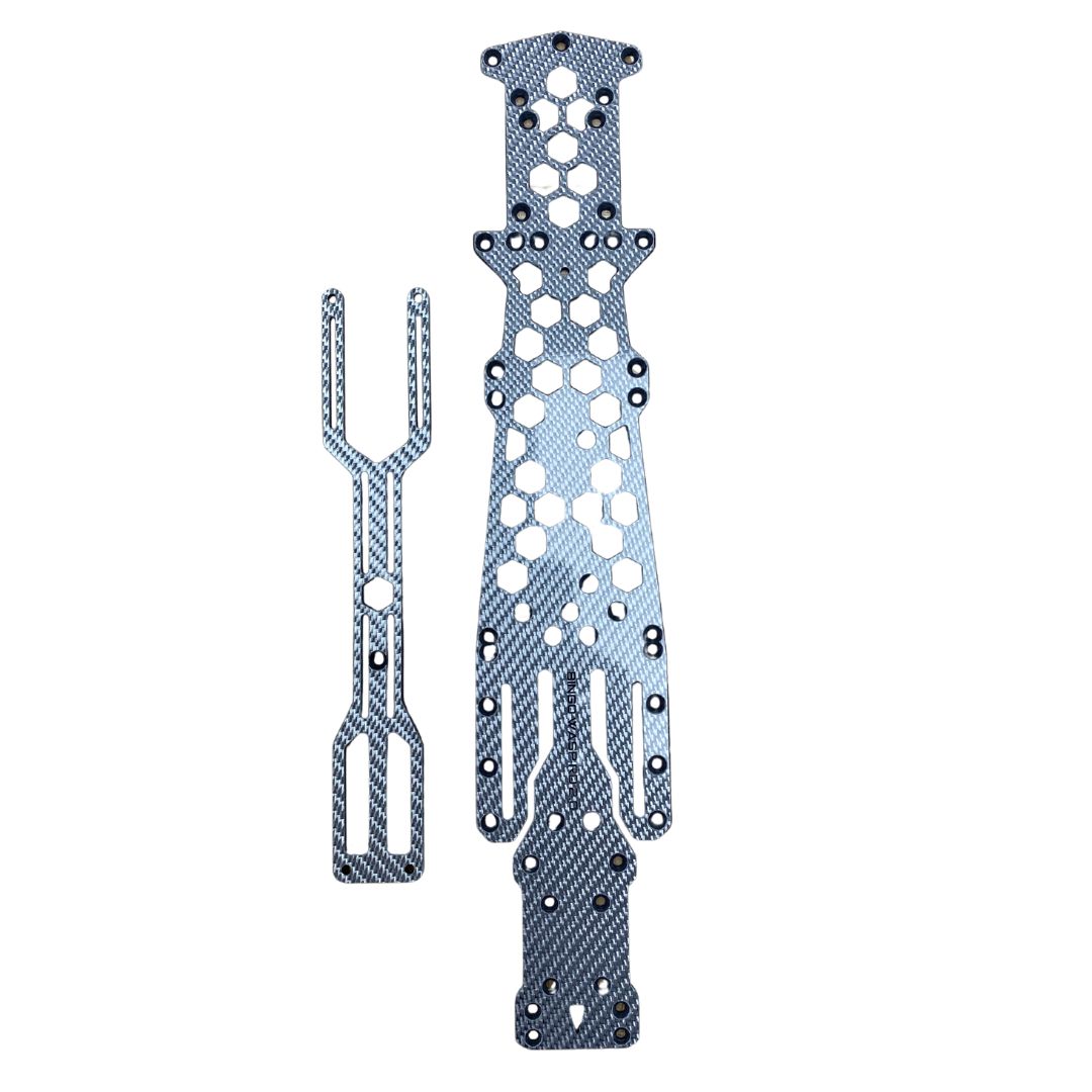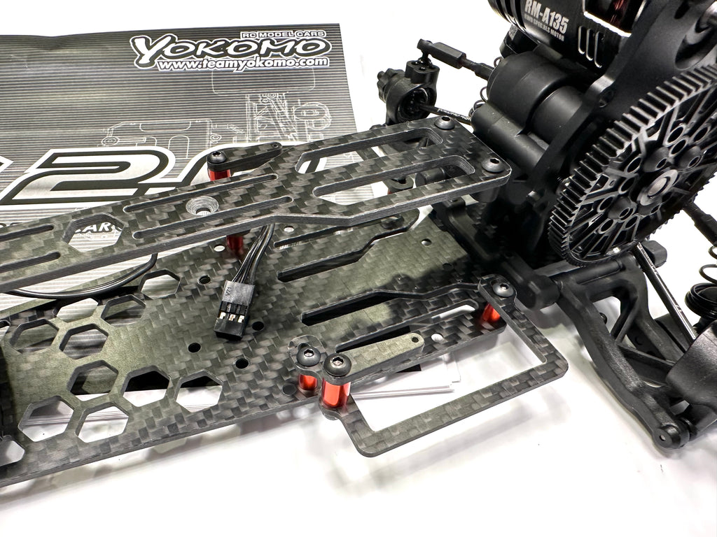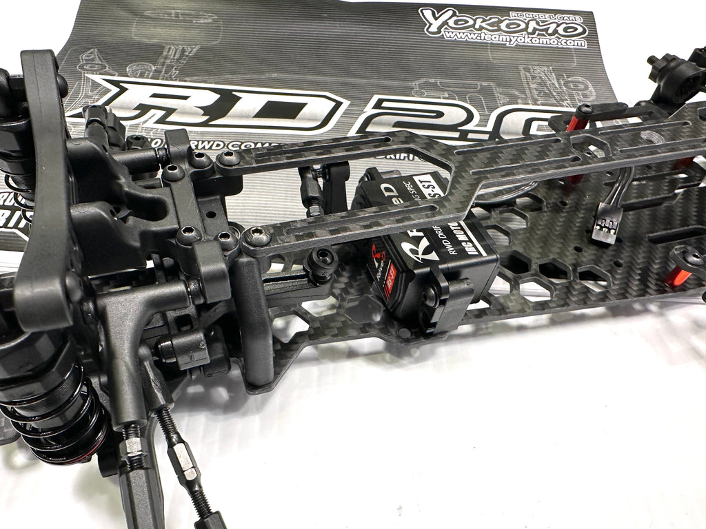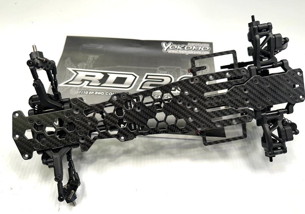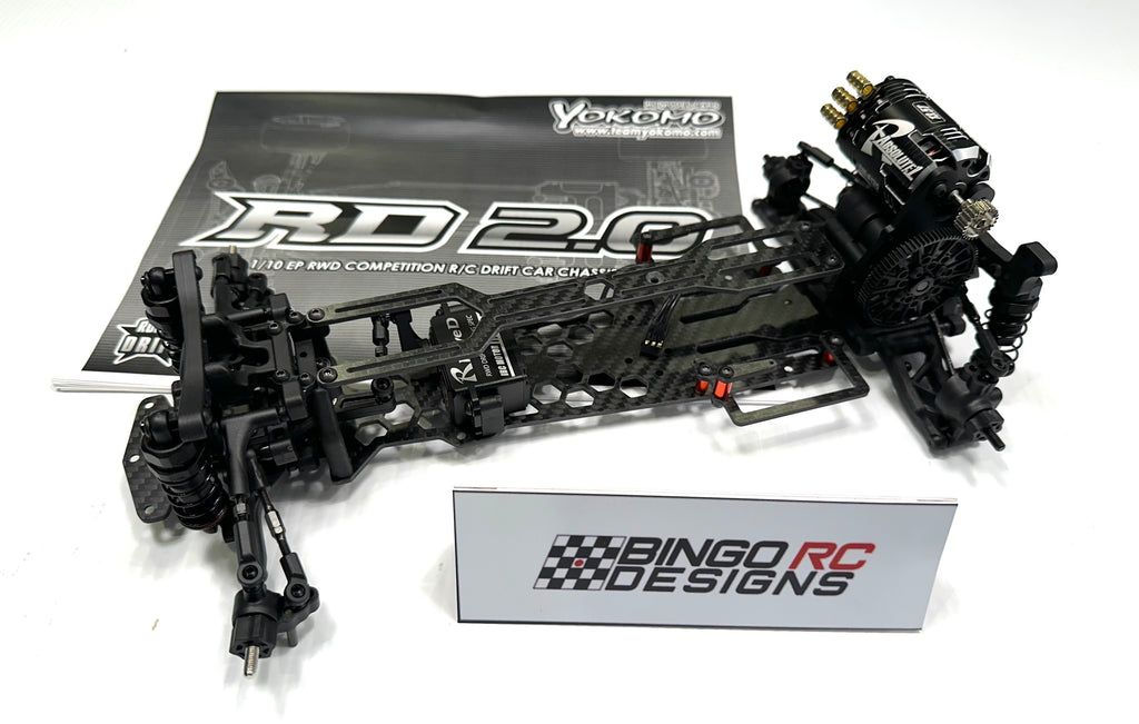 The Bingo RC Designs Wasp RD 2.0 is an upgrade chassis for the Yokomo Rookie Drift 2.0 drift car kit. The Wasp RD 2.0 replaces both the lower and upper decks with carbon fiber plates that reduce the weight and increase the flexibility over the stock plastic components.