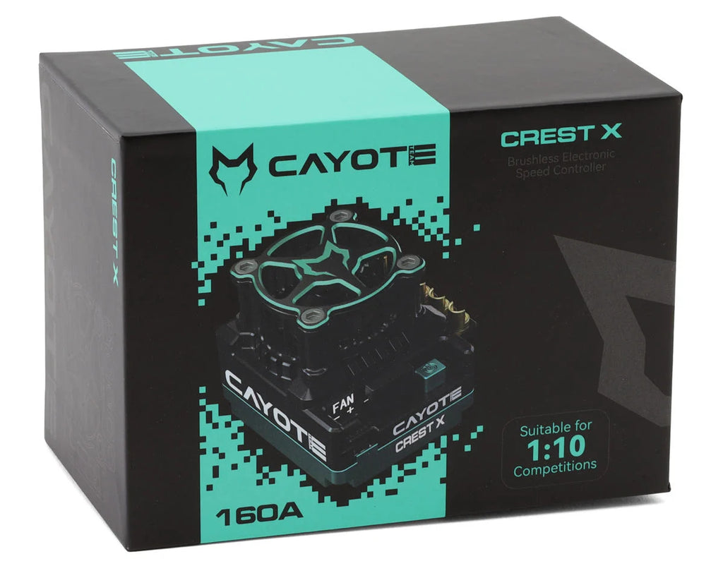 The Cayote Crest X 1/10 160A Sensored Brushless Mod Competition ESC is designed to provide maximum efficiency and power for 1/10 touring cars and off-road platforms. With advanced cooling technology and a wide range of adjustable parameters, this ESC ensures smooth performance and durability. Its smart design allows users to fine-tune their RC vehicle's power and drive settings for optimal results. Additionally, this ESC includes an optional glitch buster to help smooth out voltage fluctuations and interference in demanding RC applications. Whether you're on the track or testing different terrains, the Crest X ESC delivers a seamless and responsive experience.