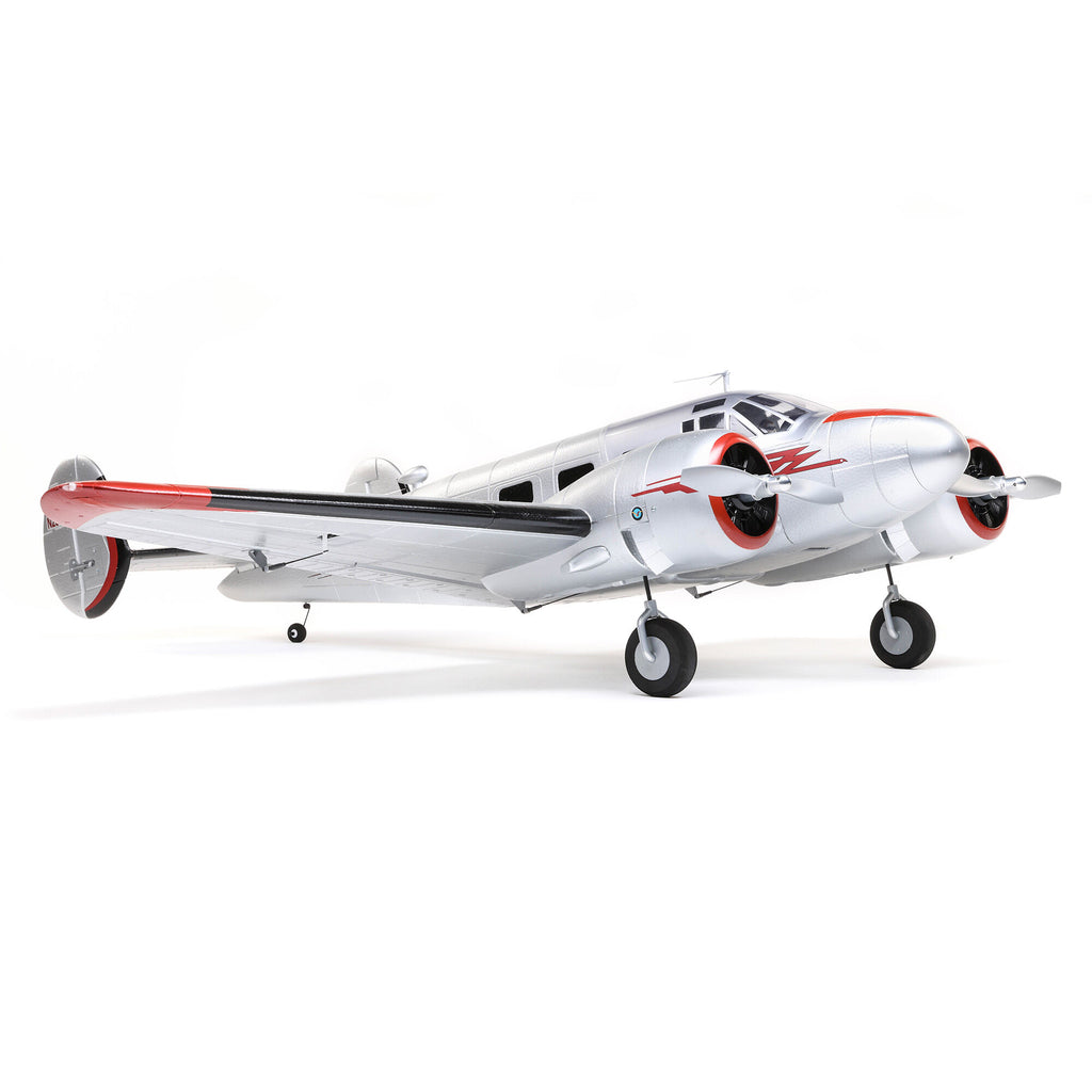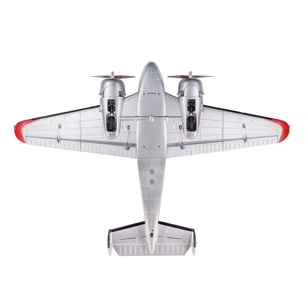 The E-flite® Beechcraft D18 1.5m is the best, most convenient, and easiest-to-fly scale model of one of general aviation's most unique and recognizable aircraft! Its twin brushless power system with specially tuned motors delivers an abundance of thrust when using a 3S LiPo battery. For more speed and vertical performance, just install a 4S pack. No modifications or upgrades are needed! It's also equipped with an exclusive 40-amp Spektrum™ Avian™ Dual Smart ESC that can provide a variety of real-time power system telemetry data with Smart and non-Smart batteries via compatible receivers (including the AR631 installed in the BNF® Basic version) and Spektrum AirWare™ equipped transmitters. The BNF® Basic version is also the only Twin Beech model equipped with AS3X® and optional-use SAFE® Select technologies to make this the easiest to fly D18 yet! Factory-finished in a classic trim scheme, the lightweight yet durable, composite-reinforced and fully-molded EPO airframe features an abundance of scale detail — molded-in panel lines and hatches, antennas, exhaust stacks, a clear cockpit, and more. Included functional flaps, twin rudders, and LED navigation lights take your experience to another level. Factory-installed electric retracts with durable metal components allow you to fly from a wide variety of surfaces including paved runways, packed dirt, and even grass. The unique 3-piece wing design makes transport and storage as convenient as possible because the center section includes the main gear and all of the sections feature innovative hands-free connections. And because no glue is required for final assembly, you can have the Beechcraft D18 1.5m ready to fly in less time than it takes to charge a battery!