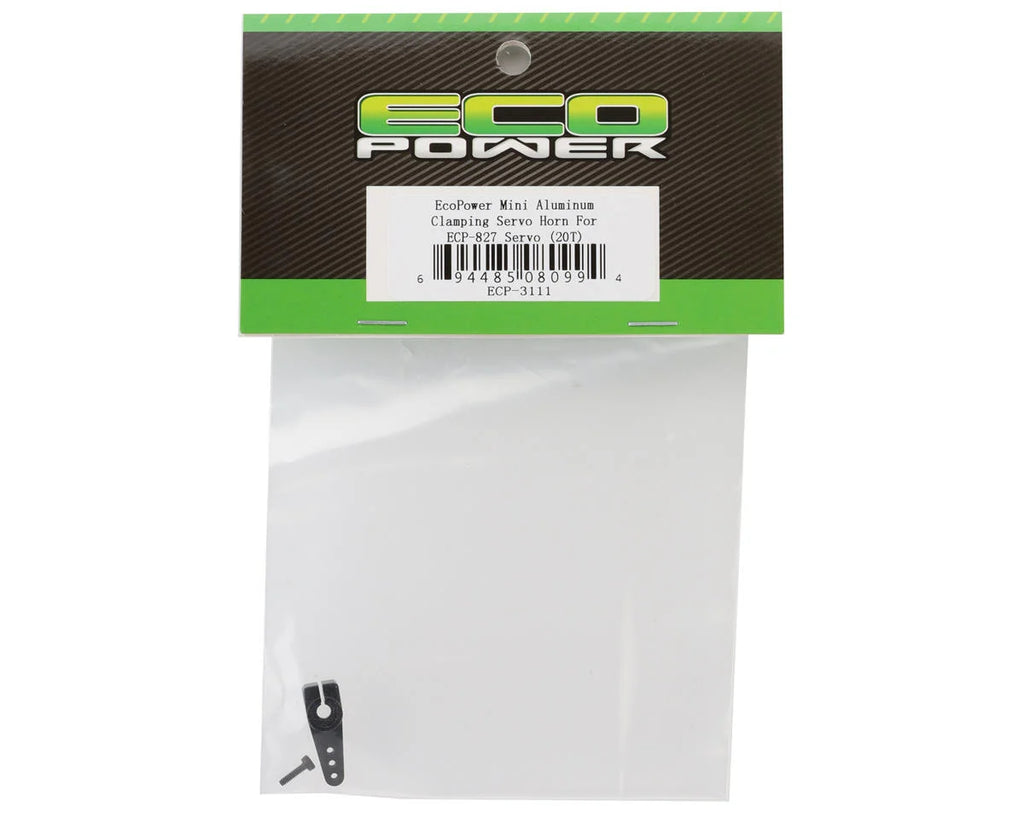 EcoPower Mini Aluminum Clamping Servo Horn. Constructed from top-quality CNC-machined aluminum and anodized black for added durability with a clamping style design that provides a supremely secure fit. In addition, the horn features three mounting holes to accommodate steering links with different lengths! This EcoPower horn is the ultimate upgrade for your 1/24 and 1/18 micro crawler platforms such as the Axial SCX24 and the FMS FCX24 equipped with the EcoPower ECP-827 micro servo or any other compatible micro servos with 20T spline!