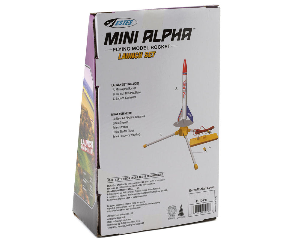 Take your first steps into model rocketry with the Estes Mini Alpha Launch Set — a beginner-oriented package built around a scaled-down take on the iconic Estes Alpha. Powered by mini engines, it delivers an exciting and approachable launch experience for first-timers and hobbyists alike. With the recommended A10-3T engine, the Mini Alpha reaches a peak altitude of 690 feet (210m), then returns safely via a streamer recovery system for repeated flights. Its compact, colorful construction and straightforward setup make it a great entry point for rocketeers of any age.