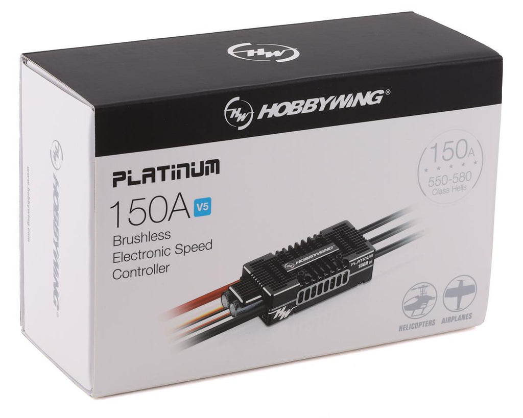 The Hobbywing Platinum Pro V5 150 Amp ESC is the next level ESC for high performance, advanced programming, and overall capabilities. Using a 32-bit processor combined with advanced algorithms, Hobbywing has maximized performance in the V5 series of Platinum Pro speed controllers. Like all Hobbywing ESCs, users can program various settings to ensure they have the needed features to match their aircraft set up needs.
