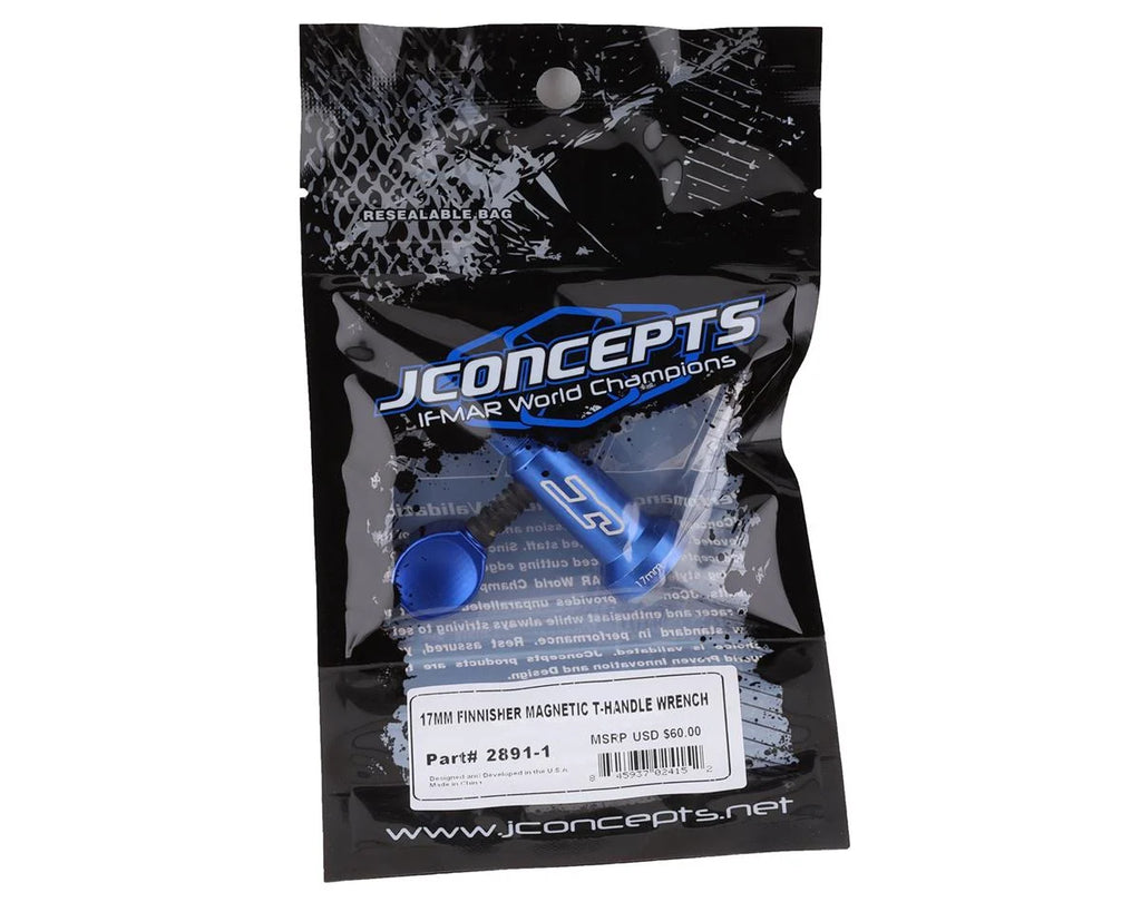 The JConcepts 17mm Finnisher Magnetic T-Handle Wrench makes taking the tires on and off a vehicle a little easier. The wrench is designed so a driver can quickly spin with the tip of the wrench in a conventional style and then move lower to the T-handle portion to lock into position. The main structure of the design is aluminum and available in either blue anodizing to provide the look and feel to the wrench. The T-handle is constructed of steel with black oxide finish attached to aluminum finger paddles for the feel and touch to adjust easier and with less pain. The wrench has etched size and JC logos for authenticity and identification.