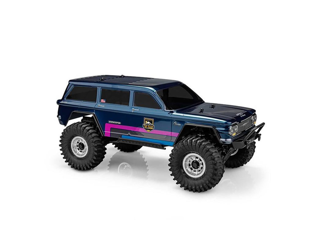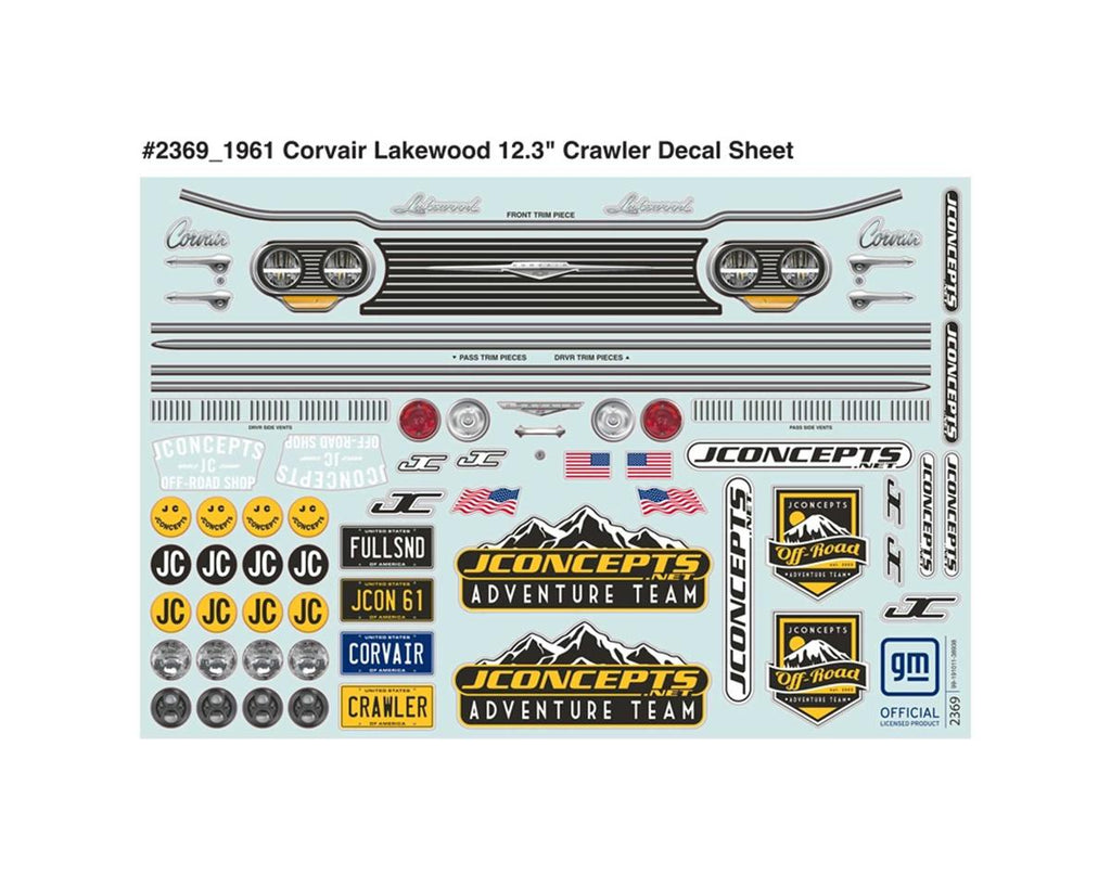 JConcepts 1961 Corvair Lakewood Rock Crawler "Pre-Trimmed" Body. This is the luscious 1961 Chevrolet Corvair station wagon rock crawling body. The Lakewood has major undercuts, specifically to show off the front headlight and bezel detail that is maximized with dual headlights. A round front bumper blends into the fender work while allowing the use of many aftermarket bumpers. The rear section of the body tucks to the bottom cutline allowing space for the round rear bumper to flow right into the design. Rear taillights are double trouble, featuring a deep pull to separate them from the rear door and hatch. This factory pre-trimmed and edged body is packaged with a full array of decals including everything you need from Corvair logos, chrome trim, and suave grille down to license plates.