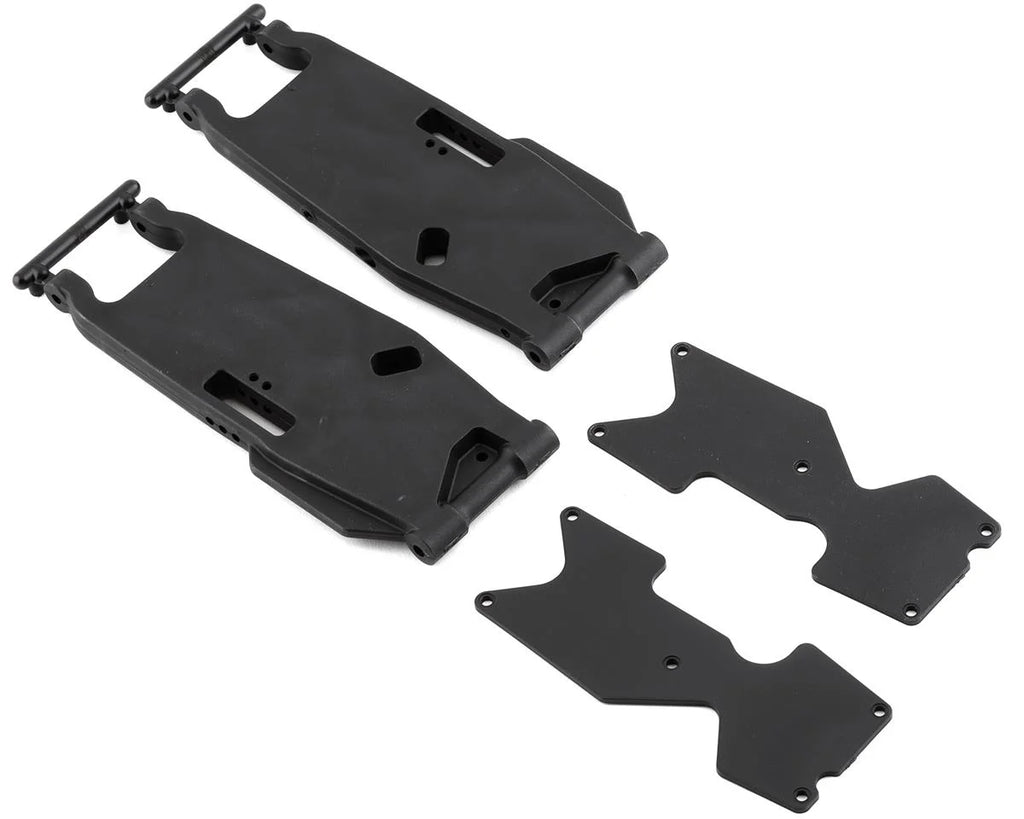 Mugen Seiki MBX8T/MBX8TE Rear Lower Suspension Arm Set. This is a replacement intended for the MBX8T and MBX8TE platform. Package includes one left rear lower suspension arm with insert and one right rear lower suspension arm with insert.