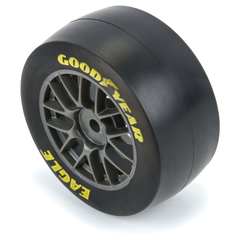 The Goodyear® Eagle NASCAR® Cup Series Primary Tires (Soft) are ready to take on competitive racing with ease. Completely transform the performance of your Stock Car racing machine with this soft compound tire! These slick tires and Cup Series wheel will give your Losi® NASCAR® Racecar a super scale look featuring yellow printed sidewall lettering and gunmetal wheels, just like the Next-Gen Cup cars use.