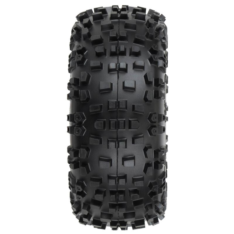 This is a pair of pre-mounted Badlands 2.8" Tires. For all you Stampede® and Rustler® fans, the wait is over for an aggressive 5" all-terrain tire! We take the guesswork out of your glue job by doing the mounting for you so you can spend your time having fun! The Badlands tire offers motocross style tread mounted on Raid Removable Hex Wheels. It is made strictly for the MX'er in you. Its oversized lugs offer you the ultimate in grass and dirt shredding performance under all-terrain conditions. The lugs are designed to ensure longevity while digging up the surface below. Made from durable M2 (Medium) compound, the Badlands tire is poised for battle and ready to take your 1:10 truck to the next level.