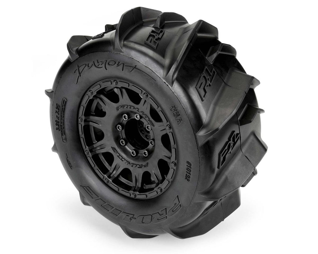 This is a pair of pre-mounted Dumont 3.8" Tires on Raid Black 8x32 Removable Hex Wheels. Are you ready for the most extreme 3.8" Paddle tires Pro-Line has ever made for 1:8 Monster Truck? Introducing the Dumont 3.8" tires that have been designed from the ground up to sling sand and snow further than ever before and look good doing it!