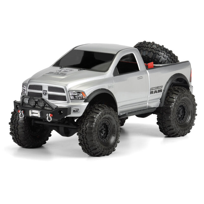 This is a RAM 1500 clear body for 1:10 Scale Crawlers. Pro-Line has something new for all of the scale rock crawling fans: a RAM 1500 body! This customized RAM body is perfect for giving your rock crawler a unique look amongst the crowd of Jeeps and Fords. The RAM 1500 body has an area in the bed made specifically for a spare tire and also features customized fender flares similar to ones found on full scale trucks. This licensed body has bold RAM 1500 styling that is a must have for your 1:10 rock crawler. Order your own and start customizing it today!