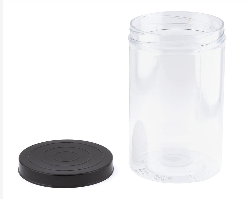 - Six airtight 8" tall, 4.75" diameter PET tubes with screw on lid