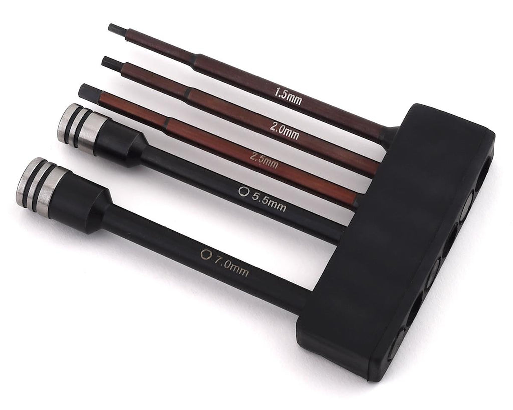 The ProTek RC "TruTorque" 5-Piece 1/4" Drive Hex & Nut Driver Set is an awesome tool kit. Great for RTR's, race chassis' and trail bags, this small and compact kit features 1/4" drive steel hex tips, combined with 1/4" drive steel nut driver tips and an ergonomically designed molded composite handle that is easy to use by hands of any size. The set includes 1.5mm, 2.0mm and 2.5mm hex tips, as well as 5.5mm and 7.0mm nut driver tips. These tips fit the handle socket precisely, and can also be used in a 1/4" drive power driver! A molded plastic tip holder is included that will hold all five tips securely. If you are looking for a tool set to get started, or even just to keep as a second set for your hauler bag, this 5-Piece set is a great option for pilots and drivers alike.