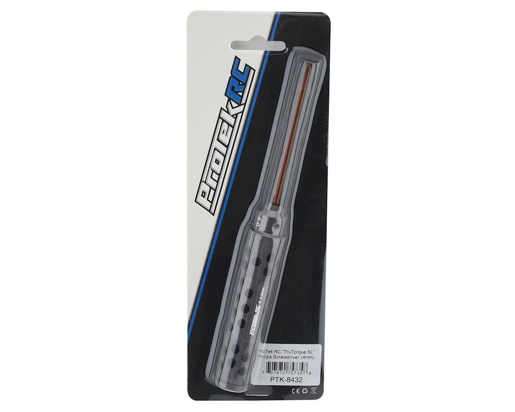 ProTek R/C "TruTorque" 4mm Phillips Head Screwdrivers feature a large 20mm diameter handle with machined relief holes and cross hatch knurling to reduce weight and provide a high grip surface. The end of the handle features a rotating end cap that allows the tool to spin in your palm, helping to minimize discomfort during long wrench sessions. Plus, the tip size is laser etched in not one - but the THREE different spots on the handle to help simplify identification.