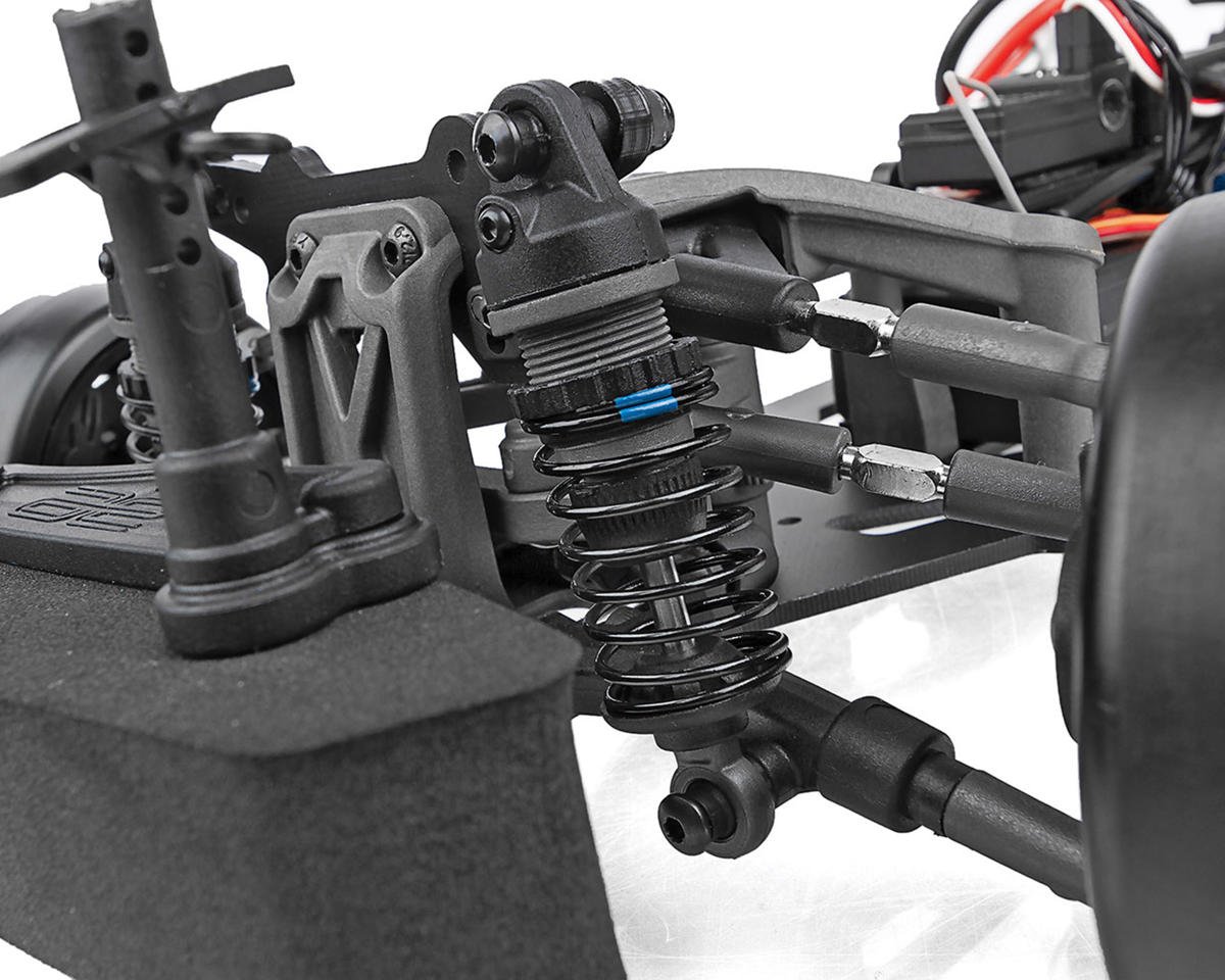 The Team Associated DC10 boasts a meticulously crafted 2.5mm G10 chassis and top plate, engineered for optimal weight distribution and balance. This lightweight yet robust chassis is complemented by fully adjustable camber and toe links and G10 shock towers, providing a solid foundation for high-performance drifting. The chassis also features a +6mm transmission height adjustment insert, which raises the roll center and accommodates larger spur gears, enhancing the vehicle's stability and control during high-speed drifts.