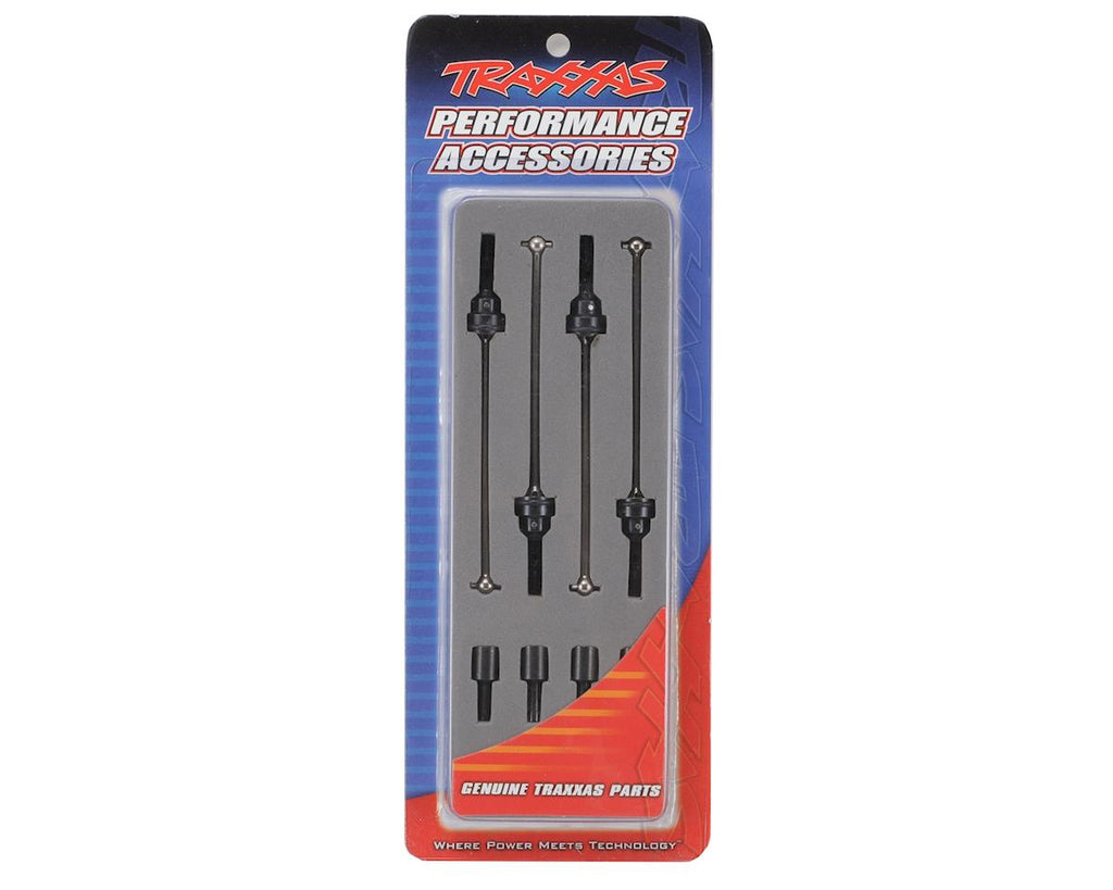 Steel constant velocity driveshafts are designed to handle the extreme horsepower and articulation that Traxxas 1/16 scale vehicles can dish out. The U-joint pins are held in place by a heavy duty O-ring so you never have to worry about losing a pin. The nickel plated steel shafts and black oxide treated accents not only look good, they are designed to exacting specifications for ultimate strength and performance.