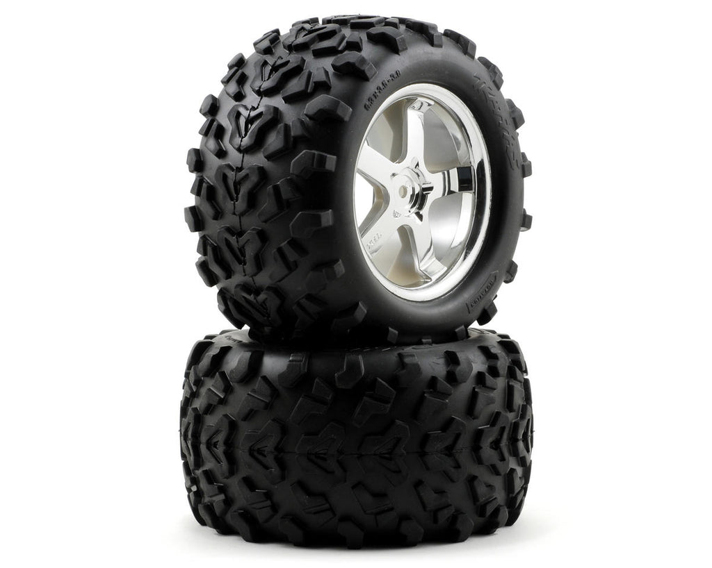 The massive 6.3” Maxx wheel and tire combo deliver incredible grip off-road and increased ground clearance to overcome deep ruts and huge obstacles. They come pre-glued to 3.8" chrome Hurricane wheels and are designed with a unique soft compound to maximize performance in a wide variety conditions. On off-road terrain the aggressive treads dig deep providing superior bite and massive roosts. On pavement the balanced grip allows just the right amount of scrub to maintain a sure-footed neutral feel.